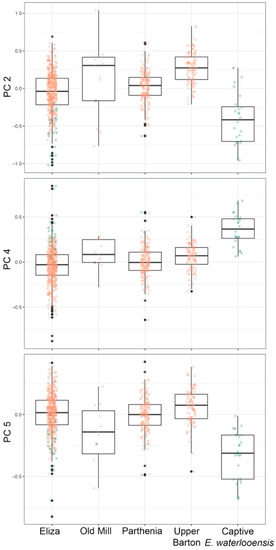Although initially considered a primarily surface-dwelling species, the description of E. sosorum noted that the species is morphologically intermediate between surface-dwelling and subterranean salamander populations [17]. Recent research has confirmed that the species uses both surface and subterranean groundwater extensively [12,20,39,40]. Because our landmark configurations were the same for both E. sosorum and E. waterlooensis, separate PCAs were directly comparable, and we noted that variation is more complex for E. sosorum. One possibility for the more complex covariance structure could be related to the fact that E. sosorum regularly exploits two different environments and their interface, promoting different selection regimes within the species. We noted microgeographic intraspecific variation that seemed to reflect aspects of morphology related to troglomorphism. For example, E. sosorum at Old Mill had factor scores on PC4 and PC5 that were more similar to captive E. waterlooensis (Figure 5), and individuals from this subpopulation might inhabit the subterranean parts of the springs, as they are found rarely at the surface at this site. Alternatively, the more troglomorphic phenotypes at Old Mill might represent higher frequency of undetected hybridization with E. waterlooensis relative to other spring outflows. Taken together, these results suggest that natural hybrids might be difficult to distinguish phenotypically given the extensive variation in E. sosorum that includes troglomorphic features.