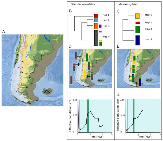 - Zemlak, S.T.; Habit, E.M.; Walde, S.J.; Battini, M.A.; Adams, E.D.; Ruzzante, D.E. Across the southern Andes on fin: Glacial refugia, drainage reversals and a secondary contact zone revealed by the phylogeographical signal of Galaxias platei in Patagonia. Mol. Ecol. 2008, 17, 5049–5061. [Google Scholar] [CrossRef]