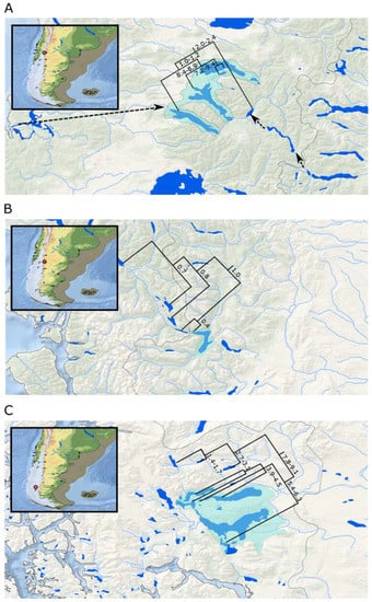 - Ruzzante, D.E.; Simons, A.P.; McCracken, G.R.; Habit, E.; Walde, S.J. Multiple drainage reversal episodes and glacial refugia in a Patagonian fish revealed by sequenced microsatellites. Proc. R. Soc. Lond. B 2020, 287, 20200468. [Google Scholar] [CrossRef]