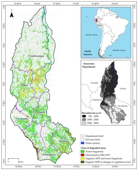 In northeastern Peruvian Andes, the Amazonas Department covers approximately 42050.37 km2 of rugged territory, covered mainly by the Amazon rainforest (Figure 1, 3°0′–7°2′ S, and 77°0′–78°42′ W), along an elevational gradient from 120 m.a.s.l. in the north to 4900 m.a.s.l. in the south. It has contrasting climates (“warm and humid”, “dry warm”, and “warm and slightly humid temperate”), ranging from maximum temperatures of 40 °C in the lowland forest in the north to minimum temperatures of 2 °C in the mountain ranges in the southern boundary; some areas have a water deficit of 924 mm/year and others have a surplus of up to 3000 mm/year []. As part of their high biophysical diversity, four ecosystems can be distinguished []: (i) lowland forest, (ii) high forest or yunga, (iii) Andean forests and grasslands, and (iv) tropical dry forest. Amazonas is composed of seven provinces (Bagua, Bongará, Chachapoyas, Condorcanqui, Luya, Rodríguez of Mendoza, and Utcubamba), and is characterized by its agricultural activity, which occupies 24.9% of the territory and generates 51.22% of the department GDP []. However, due to poor agricultural practices [,,], unsustainable forest use [], deforestation facilitated by road access [,,], and unregulated urban sprawl, 27.4% (11,533.93 km2) of the Department is degraded territory that has been incorporated into the National Map of Degraded Lands []. This map identified four classes of degradation grouped into three categories: “low” (forest fragments, 8638.91 km2), “medium” (negative Net Primary Productivity (NPP) and forest fragments, 1551.45 km2; negative NPP or changes in vegetation cover, 383.13 km2), and “high” (deforestation 2001–2017, 960.45 km2).