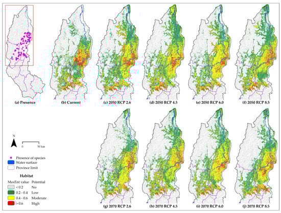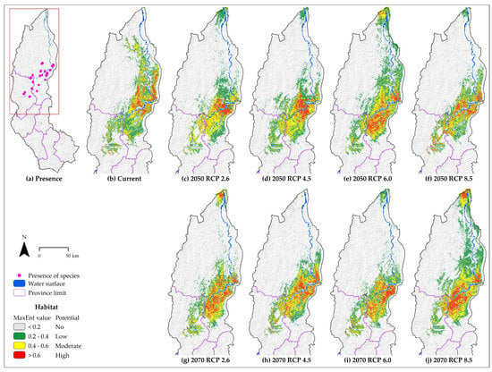- Phillips, S.J.; Anderson, R.P.; Schapire, R.E. Maximum entropy modeling of species geographic distributions. Ecol. Model. 2006, 190, 231–252. [Google Scholar] [CrossRef]