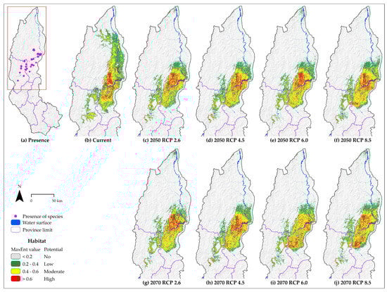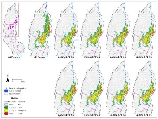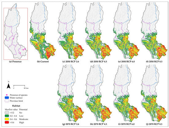 Areas of current ‘high’, ‘moderate’, and ‘low’ potential habitat under current conditions of C. montana correspond to 6.24% (2625.42 km2), 13.87% (5832.68 km2), and 20.57% (8649.03 km2) of Amazonas, respectively (Table 3). The potential ‘high’ habitat will decrease under all future scenarios, with respect to the current suitable area and with respect to 2050 (except under CCSM4 2070 RCP 6.0 scenario for 2070). This means a decrease of by up to −13.4% and −12.0% by 2050 (RCP 6.0) and 2070 (RCP 6.0), respectively, compared to the current suitable area.