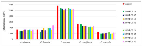 Under current conditions, the largest potential ‘high’ habitat areas of 2625.42 km2 and 1194.76 km2, respectively, were modelled for both C. montana and C. cateniformis. The species taking up the smallest area (584.39 km2) of potential ‘high’ habitat is C. pentandra (Figure 7). In such circumstances, by 2050 and 2070, 35 of the 40 models under future scenarios have projected a loss in the area of ‘high’ potential habitat ranging from −0.2 to −27.9% of the current suitable area. However, there is a significant increase in the area of habitat in the remaining five models from 12.7% to 42.5% for C. decandra and 0.2% for A. leiocarpa.