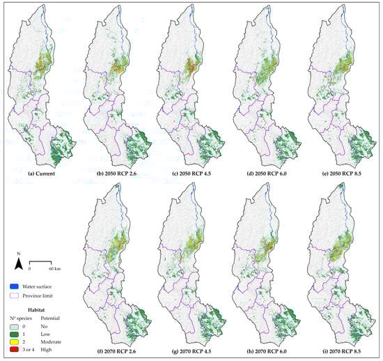 Potential distribution of ‘high’ habitat under current conditions and climate change scenarios of five TFS in Amazonas (Peru). In order to analyze the variation in area for each species, the current scenario should be compared with the same climate change scenario (RCP) in 2050 (i.e., RCP 2.6) and 2070 (i.e., RCP 2.6).