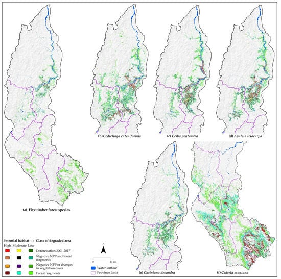 On the basis of the cartographic superposition of three potential distribution ranges (>0.2) under current conditions and the four classes of degradation of the National Map of Degraded Areas [], cross matrices were constructed. Such matrices allowed the identification of sites with different levels of restoration potential, either with the installation of individual and/or combined species. Areas of high restoration potential and priority are those that resulted from the overlap of the potential distribution of ‘high’ habitat and the ‘Deforestation 2001–2017’ degradation class (corresponding to the ‘high’ degradation category).
