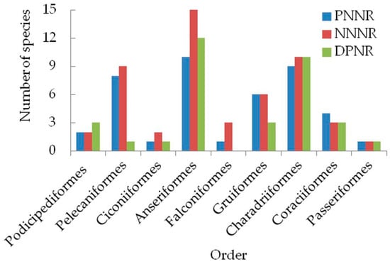 In total, 58 bird species grouped into 9 orders and 13 families were observed in the study sites (Appendix A). The order Charadriiformes consisted of a high number of families (4 families and 13 species). The number of species in the order Anseriformes recorded was exceptionally high (15 spp.) followed by Charadriiformes (13 spp.). The number of species in the order Anseriformes was higher in NNNR than PNNR and DPNR (Figure 2). Two globally threatened bird species, Siberian Crane (critically endangered) and Oriental Stork (endangered), Eurasian Curlew, Black-tailed Godwit and Northern Lapwing were near-threatened bird species recorded in our study sites. Hence this study sites were not only harbored the highest waterbird richness and abundance, but also provided a home for the highest proportion of most endangered species (Table A1).