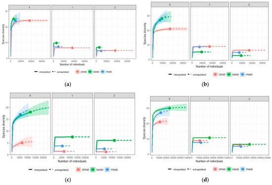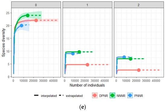Similarly, temporal variation in biodiversity indices among the study sites (PNNR, NNNR and DNNR) was observed. For instance, the highest values of diversity in the reference sample (nonstandardized data) were found in NNNR, where 49 species richness, 16.37 Shannon index and 10.35 Simpson diversity index (solid points in Figure 4b) were observed. The asymptotic estimator for species richness, Shannon diversity and Simpson diversity (i.e., Hill numbers for q = 0, 1, 2) were 51, 2.80 and 0.90, respectively. In contrast, the lowest values of the three metrics were noted in DPNR: 39, 9.92 and 6.11 (Solid points in Figure 4b) and their corresponding respective asymptotic hill numbers are 40, 2.30 and 0.84.