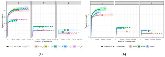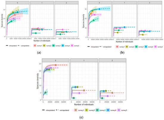 Rarefaction and extrapolation based on Hill numbers (for order q = 0, 1, 2), species richness (q = 0), Shannon’s diversity (q = 1) and inverse Simpson’s diversity (q = 2) of reference sample collected from the study sites in the five consecutive survey years ((a). Survey 1; (b). Survey 2; (c). Survey 3; (d). Survey 4; (e). Survey 5) 2016–2020. The solid line is the rarefaction curve and the dotted line is the extrapolation curve, which goes up to double the size of the reference sample. The shaded area represents 95% confidence intervals obtained using the bootstrap method based on 200 replication.