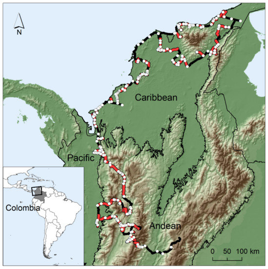 Colombia, with a surface area of 1.1 million km2 and 45.4 million people [14], is one of the most biodiverse countries on Earth [15]. Differences in elevation and latitude produce large climatic variations across the country, which are responsible for the high diversity of habitats. Colombia can be divided into five continental regions (Andean, Caribbean, Pacific, Orinoco, and Amazon), with remarkable biogeographic, socio-cultural, economic, and demographic differences [16]. Using satellite maps, we designed an a priori road itinerary (4232 km in total) to cover the main biomes of the Andean, Caribbean, and Pacific regions across a wide altitudinal range (4–3520 m.a.s.l., Figure 1).