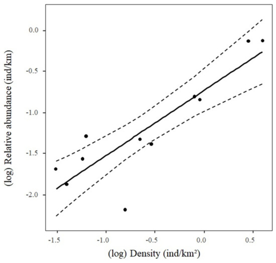 Several methodologies are available to estimate wild parrot abundances, all of them carrying different assumptions, pros and cons, and the adequate method will depend on the objectives of the study [20]. For this work, we used the relative abundance of each species, measured as the total number of individuals recorded divided by the total of km surveyed (indiv./km, [20]). This estimate of abundance has been used in other species- and community-based parrot studies [18,19,20,21,22,23,24], with the constraint that it does not account for differences in detectability among species as it is done by distance-sampling method s [22]. However, density estimates through distance sampling are not suitable for our study because (1) they cannot be obtained for rare species with a low number of contacts [22], and thus we could only model densities for 11 of the 28 study species assuming a minimum of 10 contacts per species is enough (but see [20] for the recommendation of using larger numbers of contacts for robust modelling); (2) detection distances cannot be obtained for flocks detected through vocalizations but not sighted, and thus their exclusion would underestimate densities, particularly of the smaller species; and (3) the densities obtained (indiv./km2) cannot be used as units of resource available when applying a poaching selectivity index (see below), while using the total number of individuals recorded allows it. Nonetheless, previous studies on two different parrot communities [19,21] showed that relative abundances (indiv./km) were strongly correlated to detectability-corrected density estimates (indiv./km2). We measured detection distances for assessing whether it is also the case in this study. We calculated detectability-corrected estimates of parrot densities using the software Distance [28] for 11 species for which densities could be modeled. We assumed that detection decreases monotonically with distance from the road transect [20] and modeled this process using the half-normal detection function [19]. As densities cannot be calculated using non-visual records, we recalculated the relative abundances of these 11 species excluding non-visual records to make results comparable (Table 1). Relative abundances resulted strongly correlated to density estimates (estimate: 0.80, SE = 0.15, t = 5.47, p = 0.0004, adjusted R2: 0.74; Figure 2). These results add further support to the idea that relative abundances of parrots obtained through roadside transects are good proxies of their actual abundance, especially when the high variability in abundance among species overcomes sources of sampling error such as differences in detectability [20].