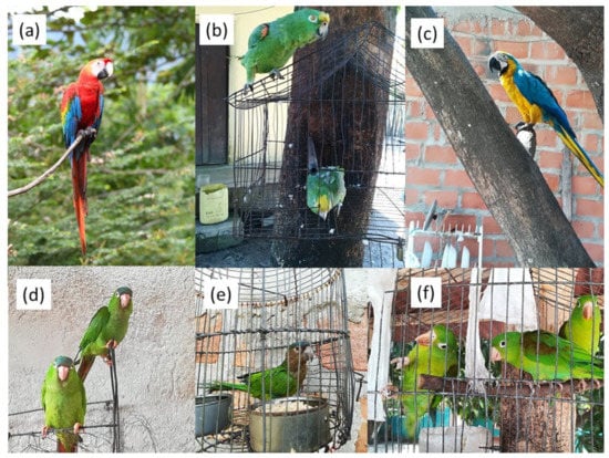 Some pet parrots observed in public spaces such as streets (a–c) or within homes (d–f). Pictures also illustrate species positively ((a): scarlet macaw Ara macao, (b) yellow-crowned amazon Amazona ochrocephala, (c) blue-and-yellow macaw Ara ararauna, (d) blue-crowned parakeet Thectocercus acuticaudatus) and negatively selected by people as pets ((e) brown-throated parakeet Eupsittula pertinax, and (f) orange-chinned parakeet Brotogeris jugularis). Pictures: P. Romero-Vidal and J.L. Tella.