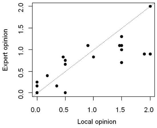 Scatterplot of the averaged opinion on the ability of different parrot species from Colombia to imitate human speech (0 = lowest, 2 = highest) provided by international experts and by local pet owners. Each dot represents a species, and the dashed line represents the theoretic perfect correlation.