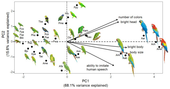 Principal component analysis (PCA) of Colombian parrot traits, namely: body size, coloration (bright body, bright head and number of colors) and ability to imitate human speech. See Tabl 2 for species abbreviations. Drawings of parrots are not scaled. PC2 is plotted to allow better visualization of species across the PC1 axis, which reflects parrot attractiveness, but was not used for further analysis (eigenvalue < 1).