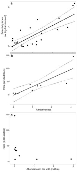 PC1 was positively related to the Savage index (estimate: 0.27, SE: 0.04, t = 6.40, p < 0.0001, adjusted-R2 = 0.63), showing that the most attractive species were poached in larger numbers than expected based on their availability in the wild (Figure 7a). The price of the species increased with their attractiveness (estimate: 16.24, SE: 4.06, t = 4.00, p < 0.0052, adjusted-R2 = 0.65, Figure 7b) but was unrelated to their abundances in the wild (estimate: 0.85, SE: 0.78, t = −1.09, p = 0.3139, Figure 7c), indicating that the most attractive but not the rarest species were more valuable.