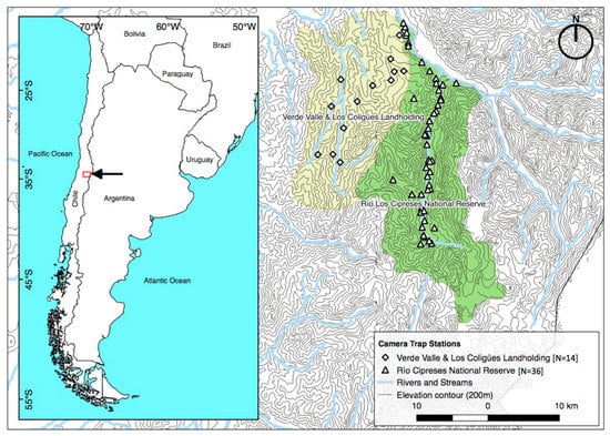 This study was conducted in the Andean Mediterranean Region of central Chile [], specifically, Río Cipreses National Reserve (RCNR), a 36,882 ha protected area without livestock and Verde Valle-Los Coligües Landholdings (VV&LC), two private landholdings where cattle and horses are raised, comprising 30,949 ha [] (Figure 1).