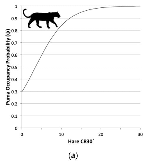 We used a small number of habitat and biotic variables—due to our small sample size once we removed VV&LC stations—we thought it to be most influential in this system and likely explain carnivores site use and detection probabilities []: habitat (forest, shrubland, or Andean steppe), elevation, distance to the main river (Cipreses river), distance to the border of the reserve, capture rates (both CR30min and CR24h) of prey (hares, rabbits, small mammals, and guanacos) and of the competing carnivore at each camera-site. We expected occupancy probability for both species to be negatively influenced by elevation because topography is extremely rugged at higher elevations and elevation has been regarded as an influential variable to carnivore spatial distribution elsewhere [,]. We also expected that detection would increase for both species closer to rivers because water can be scarce, and we expected carnivores to seek out water in areas they already occupied, as found elsewhere []. Since human disturbance (e.g., livestock grazing and tourism) increases near the edges of the reserve, we expected occupancy for pumas to increase farther away from the reserve boundary, which would limit contact with livestock ranches and tourism activities. In contrast, foxes might be more tolerant of disturbance due to their smaller size and may not be affected by distance to border, especially considering the reserve borders are somewhat “soft” containing a gradient marginal habitat. Additionally, foxes might take advantage of puma absence near the border and have higher hunting rates. In addition, we expected occupancy and detection of both species to be positively influenced by hare capture rate since hares occur in the diets of both carnivores, but that only rabbits and small mammals would positively influence fox occupancy and detection because these prey items occur in the fox diet but only have a marginal contribution to puma diet [,,,]. Finally, we did not expect puma occupancy or detection to be influenced by fox capture rate, but that fox occupancy and particularly detection could be negatively influenced by puma capture rate.