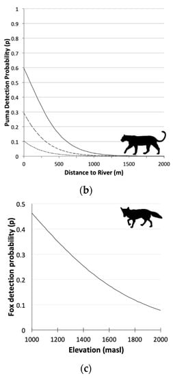Puma occupancy and detection probabilities (a,b) and fox detection probabilities (c) from the top single-species models for camera-trap data from Río Cipreses National Reserve (2015), Chile. (a) Puma occupancy (Ψ) as a function of hare 30 min capture rates per 100 trap night (Hare CR30min)’; (b) Puma detection (p) as a function of distance to the river (m) at high—(CR24h = 30, solid line), medium—(CR24h = 15, dashed line), and low—(0 CR24h = 0, dotted line) hare 24-h capture rates (Hare CR24h). (c) Fox detection probability (p), as a function of elevation (meters above sea level—m.a.s.l.), starting at 1000 m.a.s.l. (the lowest elevation at the site).