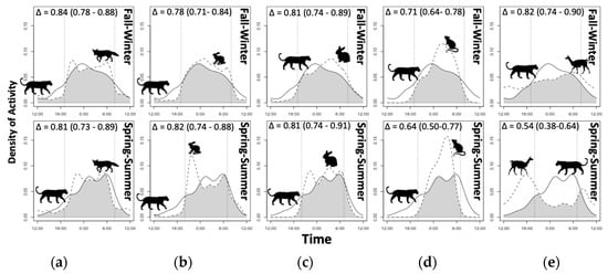 Puma activity pattern (solid line) compared to fox and prey species patterns (dashed lines) from 56 camera-traps from Río Cipreses National Reserve (2015) and Verde Valle & Los Coligües Landholdings (2012–2013), Chile: puma overlap with (a) foxes, (b) hares, (c) rabbits, (d) small mammals and (e) guanacos for both fall–winter (top) and spring–summer (bottom) Estimated overlap (represented by the gray areas) and overlap coefficients are displayed as Δ (95% CI). Vertical dotted lines show the sunset (left) and sunrise (right) times.