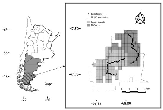 Left: Location of the Bosques Petrificados de Jaramillo National Park (BPJNP) in the Santa Cruz province (grey region with oblique bars), southern Argentine Patagonia (grey shaded regions). Right: spatial distribution of bait station lines designed for fox population monitoring (black dots), and sampled grids for monitoring the puma population in each abandoned sheep ranch.