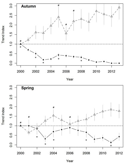 Culpeo (black dots) and grey fox (grey triangles) population trends based on the imputed trend indices estimated by the most parsimonious time-effect model (stepwise time effect model; Supplementary Material Table S1) for each season: autumn (2000–2013) and spring (2000–2012). Time-points identified by the model as significant change points on the population trends are marked with asterisks (*) for the culpeo fox and hashes (#) for the grey fox. Vertical bars represent the SE of trend indices. Horizontal dashed lines represent the index value for the base year (2000).