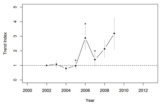 Puma population trends based on the imputed trend indices estimated by the most parsimonious time-effect model (stepwise time effect model; Supplementary Material Table S1) for autumn (2002–2009). Time points incorporated in the model as significant change points on population trend are marked with asterisks (*). Vertical bars represent the SE of trend indices. The horizontal dashed line represents the index value for the base year (2002).