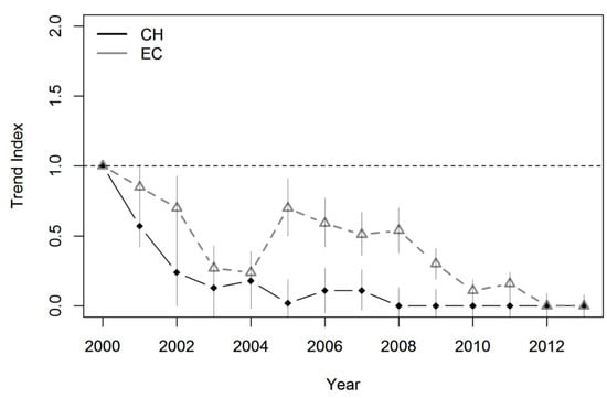 A significant ranch effect (EC: El Cuadro ranch; CH: Cerro Horqueta ranch) on the population trends of the culpeo fox in autumn. Population trends are based on the imputed trend indices estimated by a simple linear trend model (without change points; Supplementary Material Table S1). Vertical bars represent the SE of trend indices. The horizontal dashed line represents the index value for the base year (2000).