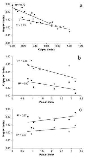 The grey fox showed an increasing trend with the decreasing trend of the culpeo fox population (Figure 5). Simple regression models showed significant negative relationships between the trends for the two fox species, both in autumn (R2 = 0.70, F1,10 = 23.94, p < 0.001 ) and spring (R2 = 0.79, F1,9 = 33.87, p < 0.001). A similar relationship was found between trends of the culpeo fox and puma for both seasons, with a decreasing trend of the culpeo fox mirroring the increasing trend of the puma population. These relationships were not significant either in autumn (R2 = 0.40, F1,5 = 3.37, p = 0.12) or spring (R2 = 0.36, F1,5 = 2.83, p = 0.15; Figure 5). Finally, a weak positive relationship was found between the grey fox and puma trends, both in autumn (R2 = 0.27, F1,5 = 1.90, p = 0.22) and spring (R2 = 0.40, F1,5 = 2.07, p = 0.21; Figure 5).