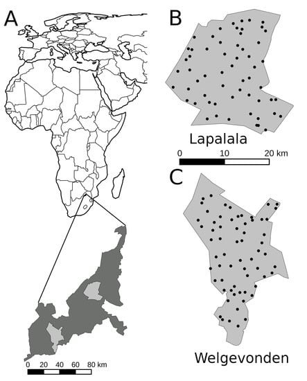 The study was conducted on two nature reserves in the Waterberg region of South Africa (Figure 1A), Lapalala Wilderness (Lapalala, 23°54′00′′ S, 28°19′23′′ E) and Welgevonden Private Game Reserve (Welgevonden, 24°19′23′′ S, 28°02′37′′ E). The Waterberg falls into the summer rainfall region with a mean annual rainfall of 500 mm and is climatically defined by a dry winter season from May to October and a wet summer season from November to April [,]. Temperatures range from 14°C to 30 °C during the summer and from 2°C to 30 °C during winter, with frosts often present at night. The area is characterised by nutrient-poor soils with rich patches, cliffs and deep valleys [], and the vegetation is classed as Waterberg Mountain Bushveld [].