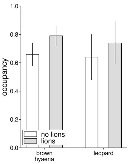 Predicted occupancy did not differ between populations living without and with lions for either brown hyaenas (χ2 = 1.28, df = 1, p = 0.257) or leopards (χ2 = 0.37, df = 1, p = 0.544), although predicted occupancy was lower for the populations living without than with lions for both brown hyaenas (without lions 0.66 ± 0.08; with lions 0.79 ± 0.07) and leopards (without lions 0.64 ± 0.16; with lions 0.74 ± 0.15) (Figure 2). We made a total of 73 temporally independent (i.e., not with the same 24-h period) observations of brown hyaenas in the population living without and 96 in the population living with lions, and made 21 and 39 observations of leopards in the populations living without and with lions, respectively. These observations were made at 33 and 39 separate camera station for brown hyaenas and at 18 and 24 stations for leopards. Average detection probabilities for brown hyaenas living without and with lions were 0.11 (± 0.01) and 0.09 (± 0.01), and average detection probabilities for leopards were 0.03 (± 0.01) and 0.04 (± 0.01).