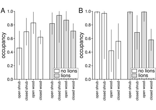 The estimated occupancy of different habitat classes did not differ between populations living without and with lions for either brown hyaenas (χ2 = 0.98, df = 3, p = 0.807) or leopards (χ2 = 0.09, df = 3, p = 0.993). However, brown hyaenas living without lions had higher estimated occupancy in closed scrubland and open woodlands than in open scrubland and closed woodland, whereas there were less pronounced habitat differences for brown hyaenas living with lions (Figure 3A). Leopards living without lions had higher estimated occupancy in scrublands than in woodlands, whereas leopards living with lions had higher estimated occupancy in open scrubland and open woodland than in closed shrub- and woodland (Figure 3B).