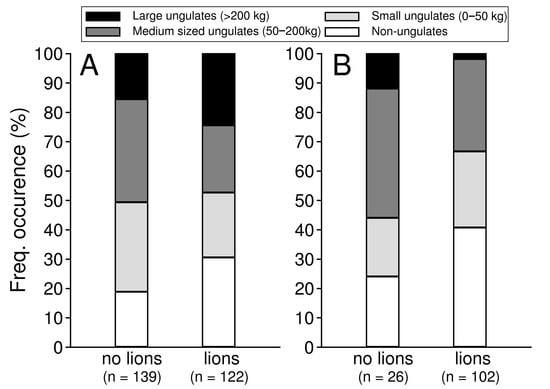 - Chizzola, M.; Belton, L.; Ganswindt, A.; Greco, I.; Hall, G.; Swanepoel, L.; Dalerum, F. Landscape level effects of lion presence (Panthera leo) on two contrasting prey species. Front. Ecol. Evol. 2018, 6, 191. [Google Scholar] [CrossRef]