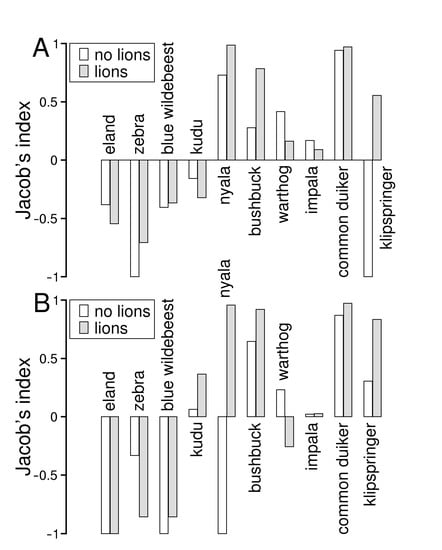 Selection of main prey species, quantified as Jacob’s index, of brown hyaenas (A) and leopards (B) in a reserve without (Lapalala) and with lions (Welgevonden). Jacob’s index ranges from −1, which indicates strong avoidance, to 1, indicating strong preference.