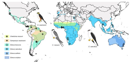 Elaninae Blyth, 1850, are traditionally considered as one of raptor subfamilies of the family Accipitridae Viellot, 1816 [,,]. They are small and medium-sized red-eyed kites and inhabit mostly semi-open and open tropical biomes in all continents [,] (Figure 1). Actually, this small group counts three genera, and two of them Gampsonyx (Vigors, 1825) and Chelictinia (Lesson, 1843) are monotypic. The small-tailed colorful Pearl Kite Gampsonyx swainsonii (Vigors, 1825), living in Central and South America, consists of three subspecies. The Scissor-tailed Kite Chelictinia riocourii (Temminck, 1821) is a monotypic species, small gray-white kite with a long forked tail from Central Africa. The genus Elanus (Savigny, 1809), includes tropical and subtropical white-gray-black kites of medium size with short tails quite similar to each other. This taxon consists of four species: Old World cosmopolite Black-winged Kite E. caeruleus (Desfontaines, 1789) with three [,] or four [,] subspecies recognized; American White-tailed Kite E. leucurus (Vieillot, 1818) with two subspecies; and Australian monotypic kites: Black-shouldered E. axillaris (Latham, 1801) and Letter-winged E. scriptus (Gould, 1842).