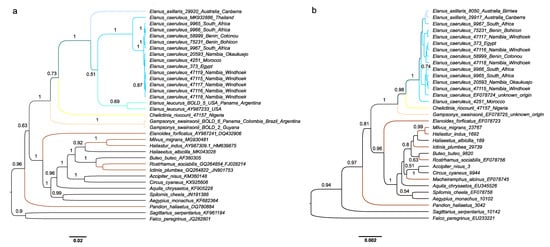 At the same time, the position of Elanus axillaris sequences is contradictory. It is separate from large species E. caeruleus on the mitochondrial tree (Figure 2a), but both sequences of this species form clade with the Black-winged Kite (Figure 2b), though its support is very low (the posterior probabilities do not exceed 0.1). Apparently, the resolution of nuclear sequences RAG-1 is not sufficient to separate these species. Nonetheless, the tentative separation in mitochondrial but not in nuclear sequences may offer support to the suggestions of Debus [] that the Australian E. axillaris is a recent species, split from E. caeruleus of the Old World. E. axillaris as well as the American E. leucurus were merged by some authors with the “main” species of the group as subspecies [,,,], which was not supported by other researchers [,,,,,]. Clark and Banks [] found conclusive evidence for the validity of these three species based on morphometric differences between them. Currently, the Black-shouldered and White-tailed Kites are mentioned as full species in the checklists [,,]. All three species are considered as allospecies, forming superspecies Elanus [caeruleus] [,,]. The presence of E. axillaris in E. caeruleus clade may mean that the Black-shouldered Kite is not homogeneous, despite the fact that there are no morphological differences inside of the species. We recognize the current taxonomic status of the Elanus species with the remark that the final composition of this genus may be changed when data from more mitochondrial and nuclear markers or even whole genomes for each species and subspecies will be available.