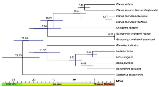 Phylogeny of elanins and other selected kites based on Bayesian Inference of the concatenated mitochondrial dataset. The secretarybird is an outgroup, node ages in million years ago are indicated on the branches. Node bars show the 95% highest posterior density of nodal age estimates.