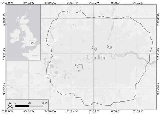 A map of London with the three parks surveyed outlined in bold. (1) Richmond Park, (2) Regent’s Park and (3) Victoria Park. Inset shows the location of London (bold outline) within the UK. Map produced with QGIS v.3.10.