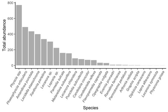 Histogram showing the total abundance of all 24 lichen species across all parks. Total abundance represents the total number of quadrats occupied on all trees. Physcia spp. represents Physcia adscendens and P. tenella combined.