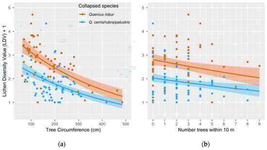 Figure 3 visually depicts the results of the generalized linear model and shows that LDV declined significantly with increasing host tree circumference (Figure 3a) and number of trees within 10 m (Figure 3b). The same relationship was observed for all host species. Figure 3 also shows the significant effect of species with Q. robur supporting higher lichen diversity than Q. cerris/rubra/palustris.