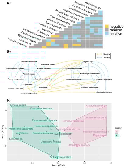 Epiphytic lichen communities from paired species co-occurrence probabilities calculated via the Veech et al. (2013) method. (a) Species co-occurrence matrix showing significant positive (blue), negative (yellow) and random (grey) co-occurrences (p < 0.025); (b) visual representation of matrix in (a) showing the emergence of two separate lichen communities, with positive co-occurrences within communities and negative between and (c) result of partitioned around medoids clustering analysis using cooccur effect sizes of paired-species co-occurrences and grouping species pairs in to k = 2 clusters.