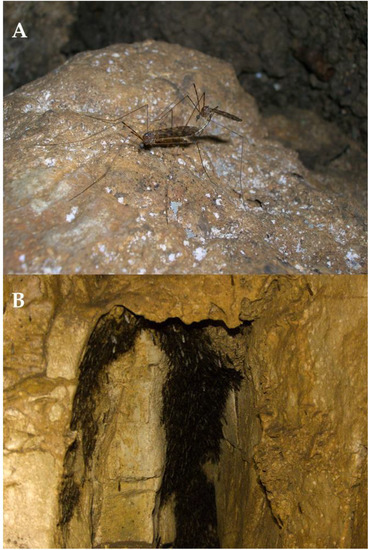 This misleading idea has been proven wrong by recent research, which highlighted that some species traditionally considered to be “occasional” actually show strong ecological relationships with the underground environment, and play a major role in subterranean ecosystems [30,31,32]. Some of such neglected species are the Tipuloidea crane flies (Diptera). Crane flies represent a large taxonomic group (>3300 described species for Palaearctic; [33]) with at least two genera, Limonia Meigen, 1803, and Neolimonia Alexander, 1964, widespread in Italy [34]. Generally, crane flies show similar size and habitus: the typical features are an elongated yellow-brownish abdomen and wings with particular venation and dark pigmentation [35] (Figure 1A). Crane flies inhabit forested areas [36,37], but are also found in subterranean environments, particularly from spring to autumn, where they shelter from external unsuitable climatic conditions (i.e., when it is too hot and dry) [38,39,40,41]. Considering the lack of specific adaptation to cave life, crane flies are usually observed in areas not too far from the connection with the surface, where they can form dense aggregations (Figure 1B) [39,42]. This condition probably makes tipuloids one of the most abundant taxonomic groups in the cave-entrance; thus, representing the most abundant prey for several cave-dwelling predators [43,44,45,46].