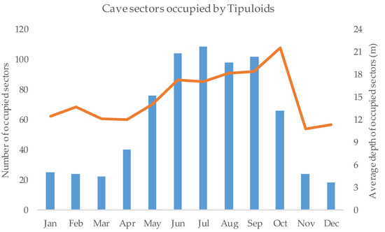 Number and distribution of occupied cave sectors. The plot shows the monthly number of cave sectors occupied by crane flies and their average depth (linear meters from the connection with surface).