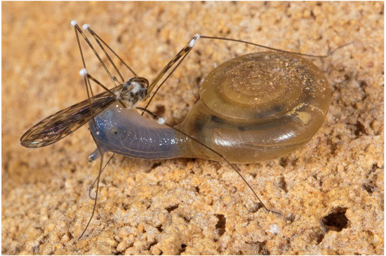 Oxychilus draparnaudi (Beck, 1837), a facultative cave-dwelling snail, feeding on a dead crane fly. In caves, crane flies are not only important for species directly preying on them, but also for the many scavengers. Photo credit: Simone Giachello.