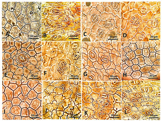 Different shapes of the epidermal cells of various studied Apocynaceae leaves investigated by light microscope (A–D, 140×) and scanning electron microscope (SEM) (E–L). (A,H): A. curassavica, (B,K): C. carandas, (C,F): D. boliviensis, (D,I): C. procera, (E): A. obesum, (G): N. oleander, (J): A. oblongifolia, and (L): T. neriifolia.