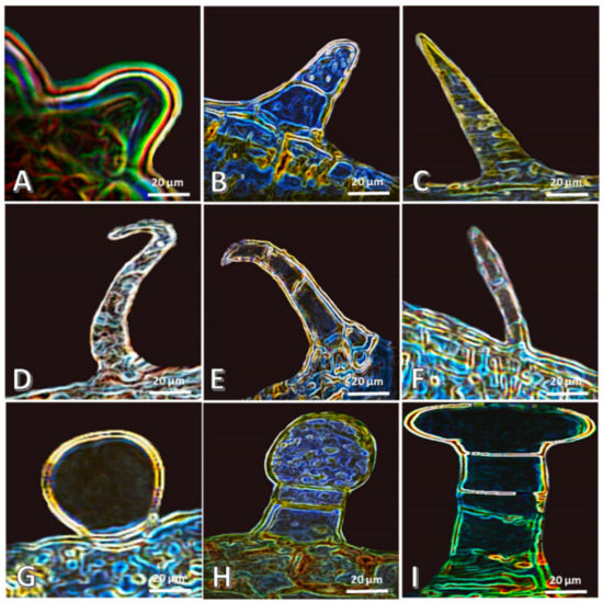 Different trichomes of the studied Apocynaceous plants examined by the light microscope at 140×. (A–C): N. oleander, (D): A. obesum, (E–H): A. curassavica, and (I): C. procera.