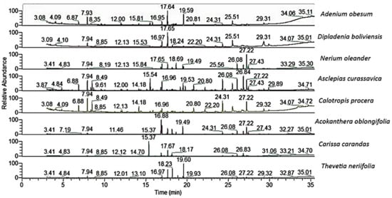 The chemical composition of the silylated alcoholic extracts of the eight studied Apocynaceae plants (A. obesum, D. boliviensis, C. carandas, N. oleander, A. curassavica, C. procera, A. oblongifolia, and T. neriifolia) are presented in Table 1, and their chromatograms are shown in Figure 5.
