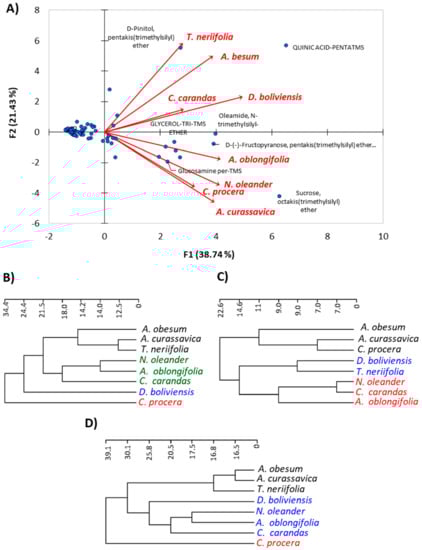 The results deduced the correlations among the eight plant species; all of these plants were located on the positive side of the cluster. On further analysis of the results, the A. curassavica, and C. procera exhibited very strong correlations based upon the abundance of the sugars and amino acids, especially the major compounds sucrose, glucosamine, oleamide, and others. In the same way, A. obesum and D. boliviensis have a significant correlation between each other in terms of their richness in quinic acid, oleamide, and fructopyranose, in addition to the other sugars and amino acids. Furthermore, the correlations between A. curassavica, C. procera, A. obesum, and D. boliviensis were found by the abundance of sugars and amino acids. N. oleander was strongly correlated with A. oblongifolia via the superiority of sucrose, D-(−)- fructopyranose, and β-D-glucopyranose, as well as other majors of sugars and amino acids. The two plants, T. neriifolia and C. carandas, showed remarkable correlation via some major constituents, such as pinitol and quinic acid, in addition to sugars, phenolic acids, and amino acids. In a general conclusion of this point, the eight plants under investigation were deduced to have a significant chemical correlation with the presence of sugars and amino acids as well as phenolic acids and iridoid glycosides.
