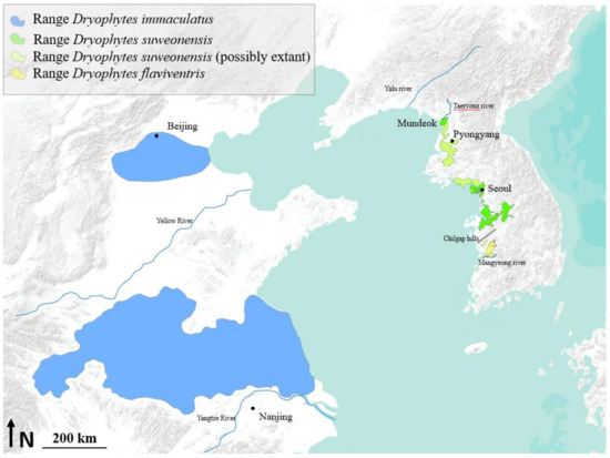 - Borzée, A.; Messenger, K.R.; Chae, S.; Andersen, D.; Groffen, J.; Kim, Y.I.; An, J.; Othman, S.; Ri, K.; Nam, T.Y.; et al. Yellow sea mediated segregation between North East Asian Dryophytes species. PLoS ONE 2020, 15, e0234299. [Google Scholar] [CrossRef] [PubMed]