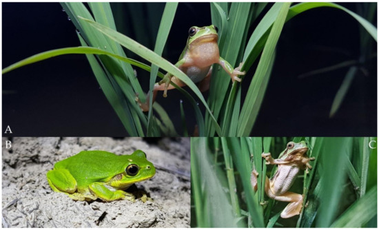 - Naito, R.; Sakai, M.; Natuhara, Y.; Morimoto, Y.; Shibata, S. Microhabitat use by Hyla japonica and Pelophylax porosa brevipoda at levees in rice paddy areas of Japan. Zool. Sci. 2013, 30, 386–391. [Google Scholar] [CrossRef]
