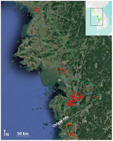 - Borzée, A.; Jang, Y. Description of a seminatural habitat of the endangered Suweon treefrog, Hyla suweonensis. Anim. Cells Syst. 2015, 19, 216–220. [Google Scholar] [CrossRef]
