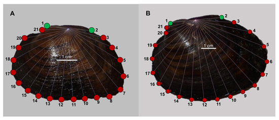 Using the photographs of the left valves, geometric morphometric analyses was carried out using Integrated Morphometrics Package v. 8 (IMP8 [25]). Homologous type I landmarks were placed on the tip of the specimen’s umbo and at the posterior end of the hinge ligament. A 40-ray fan was then placed over each shell image anchored at the median point between landmarks 1 and 2 (Figure 1).